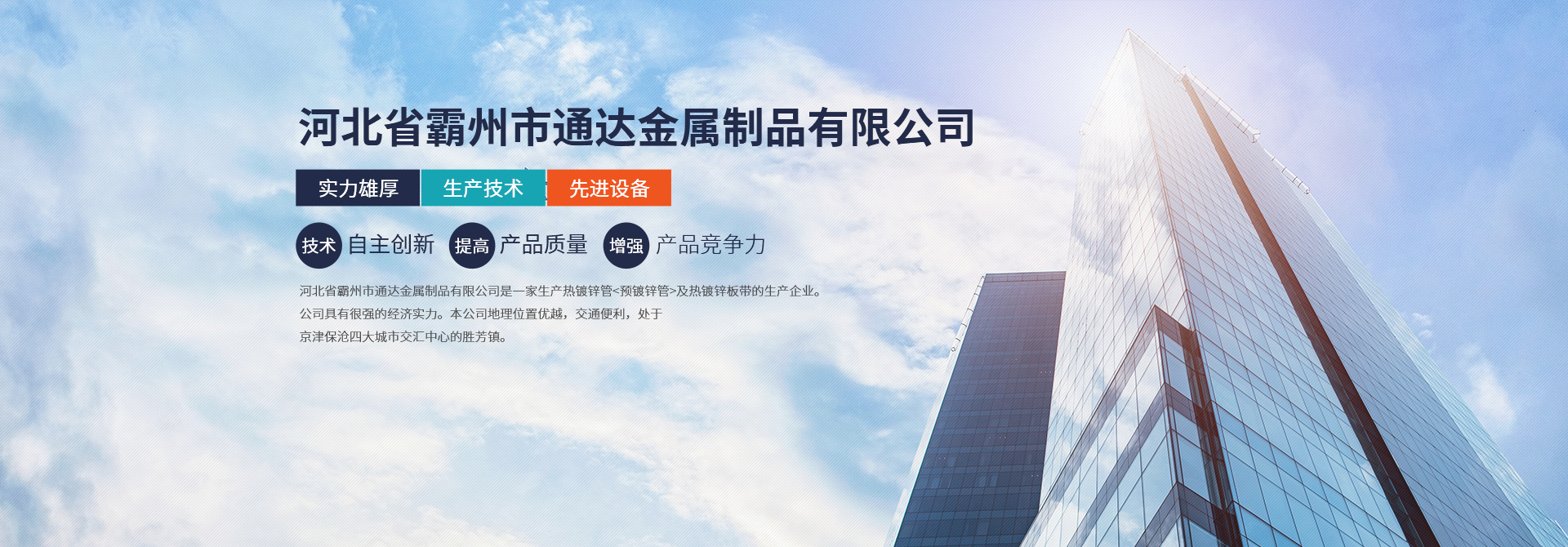 河北省霸州市通達金屬制品有限公司是一家生產熱鍍鋅管<預鍍鋅管>及熱鍍鋅板帶的生產企業。公司具有很強的經濟實力。本公司地理位置優越,交通便利,處于京津保滄四大城市交匯中心的勝芳鎮。由于公司不斷發展壯大,良好的投資環境為我公司的發展提供了可靠的保障。本公司是河北省重合同守信用企業,被評為AAA級信用企業。